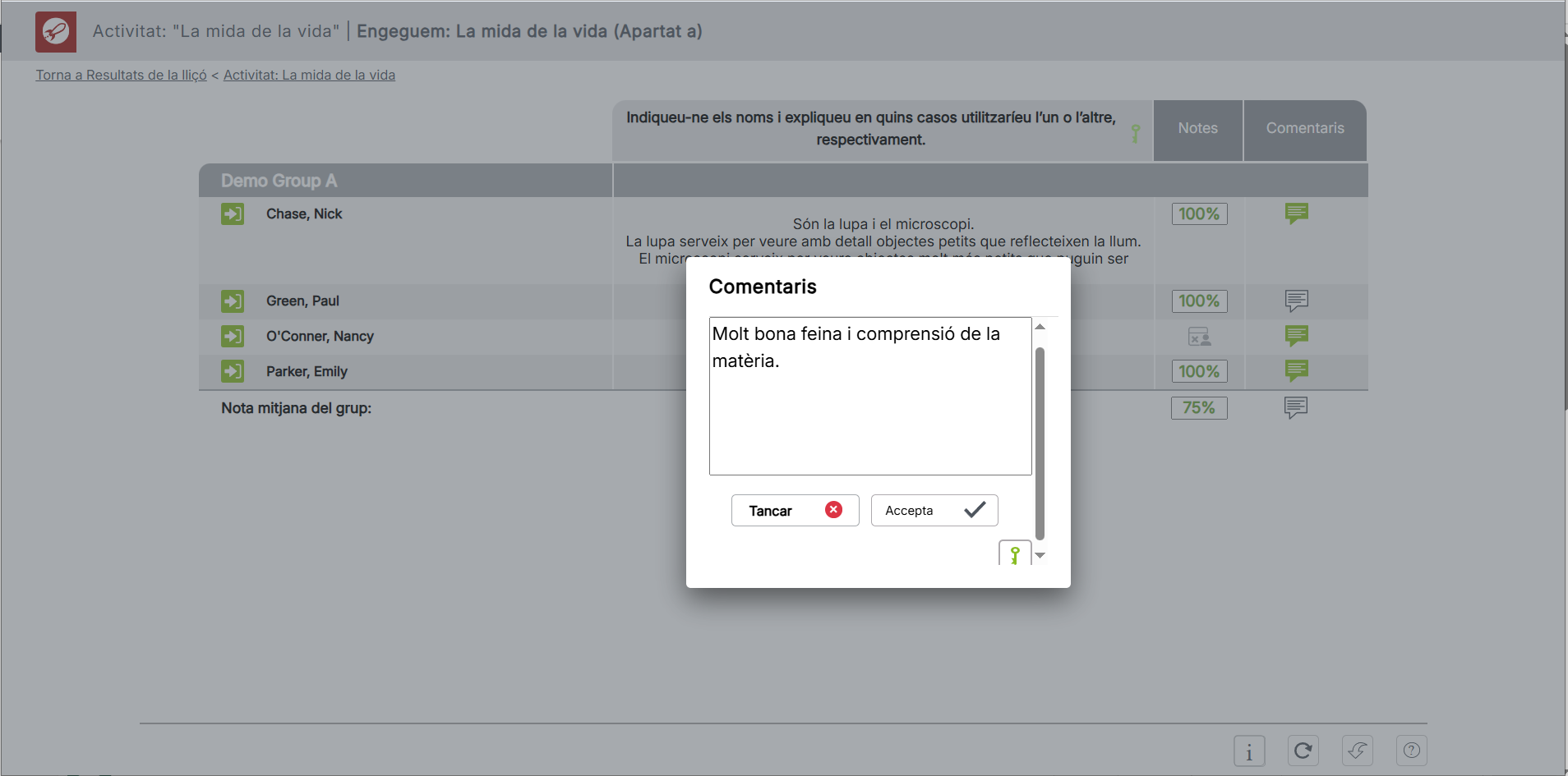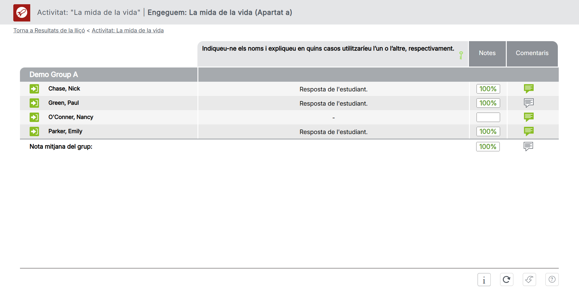 Ja és possible afegir comentaris grupals del docent des de la taula de resultats en qualsevol activitat. Igual que amb la qualificació manual a les preguntes de resposta oberta, ara pots assignar un comentari comú a tot el grup i, si ho desitges, personalitzar-lo posteriorment per a cada estudiant de manera individual.